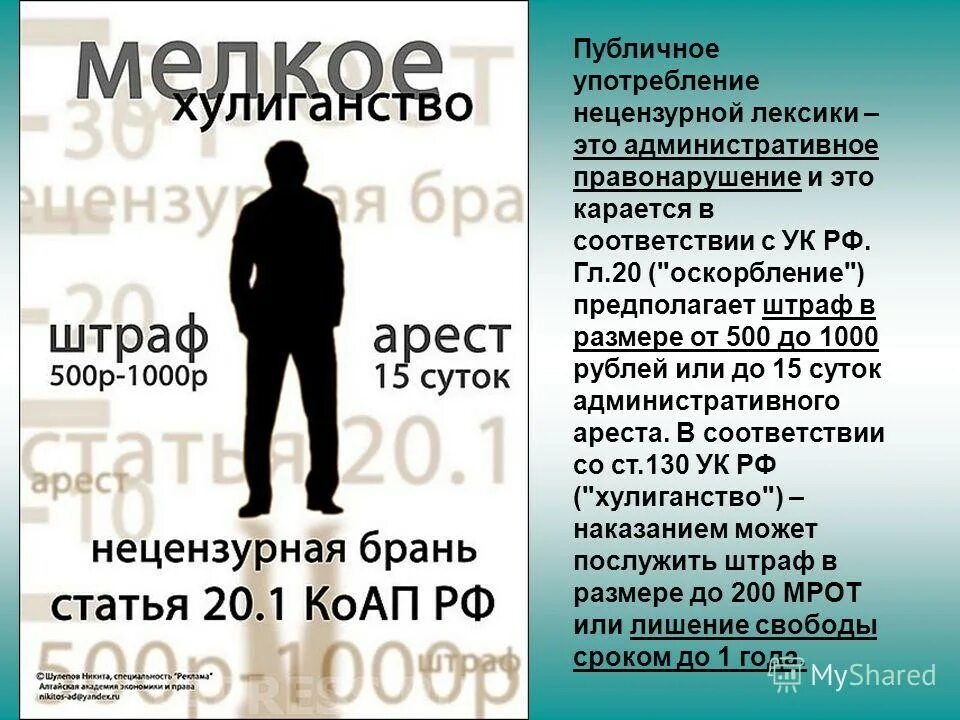 Правительство ведёт борьбу со сквернословием. Согласно статье 20.1 Кодекса об административных правонарушениях Российской Федерации: публичное употребление мата может расцениваться как мелкое хулиганство, наказываемое штрафом или административным арестом.